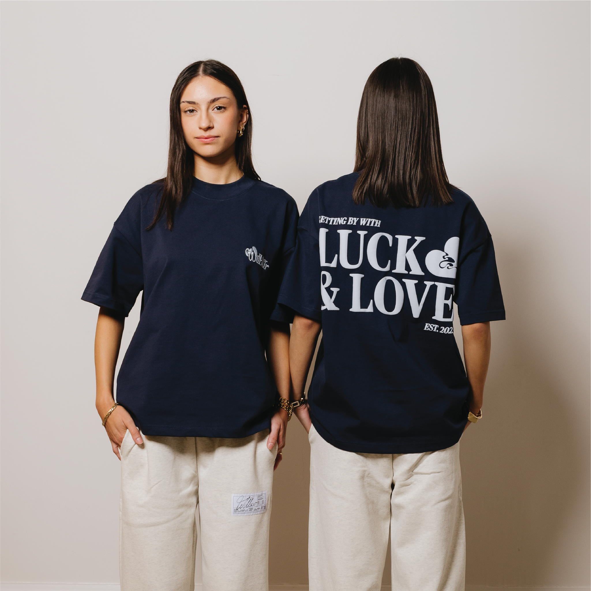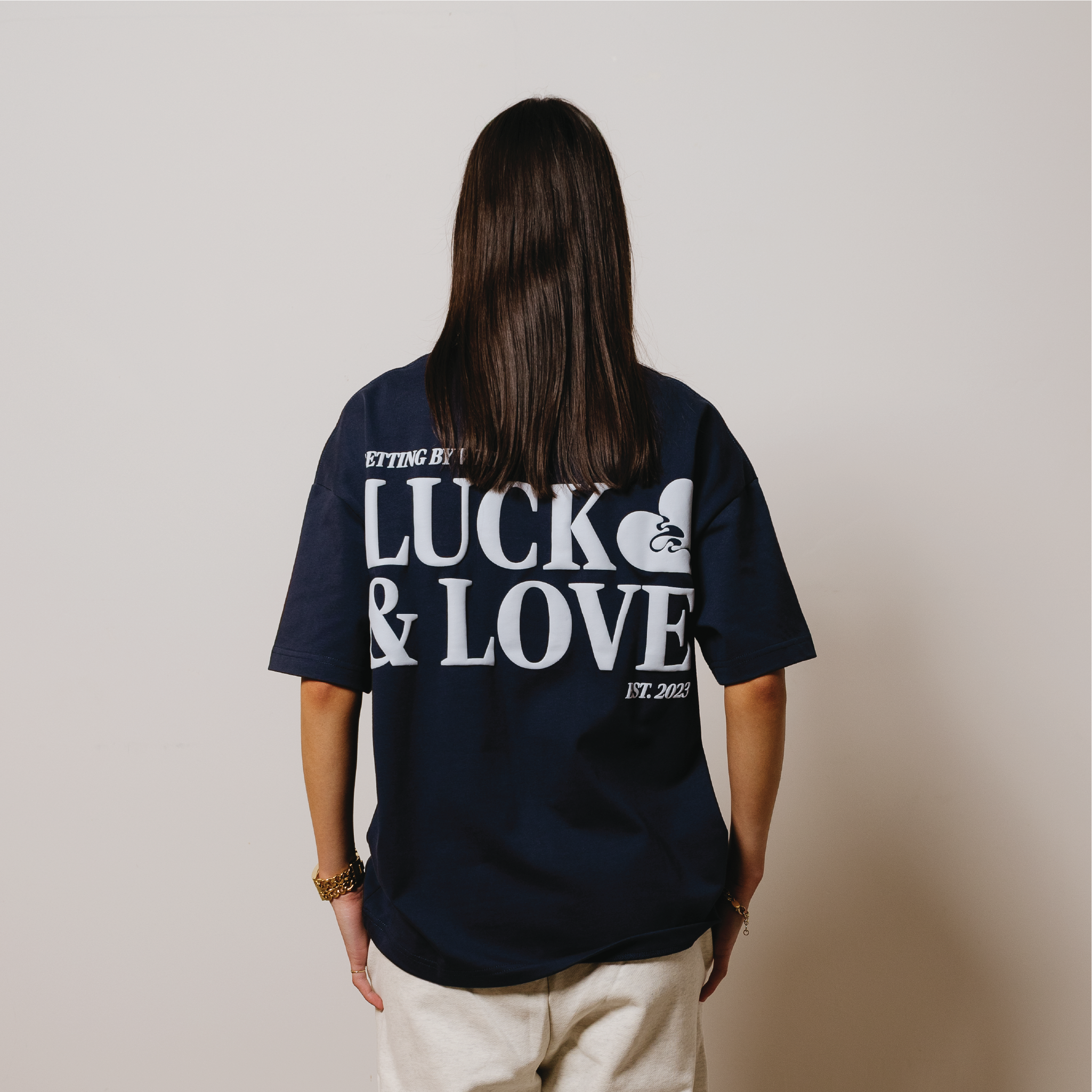 Luck & Love Premium T-Shirt, a perfect fusion of comfort and style. Crafted from top-shelf, substantial cotton, this tee features a fitted high collar for a touch of elegance, slightly cropped finish, boxy fit, all creating a modern twist to the classic design, ensuring a contemporary and flattering silhouette.